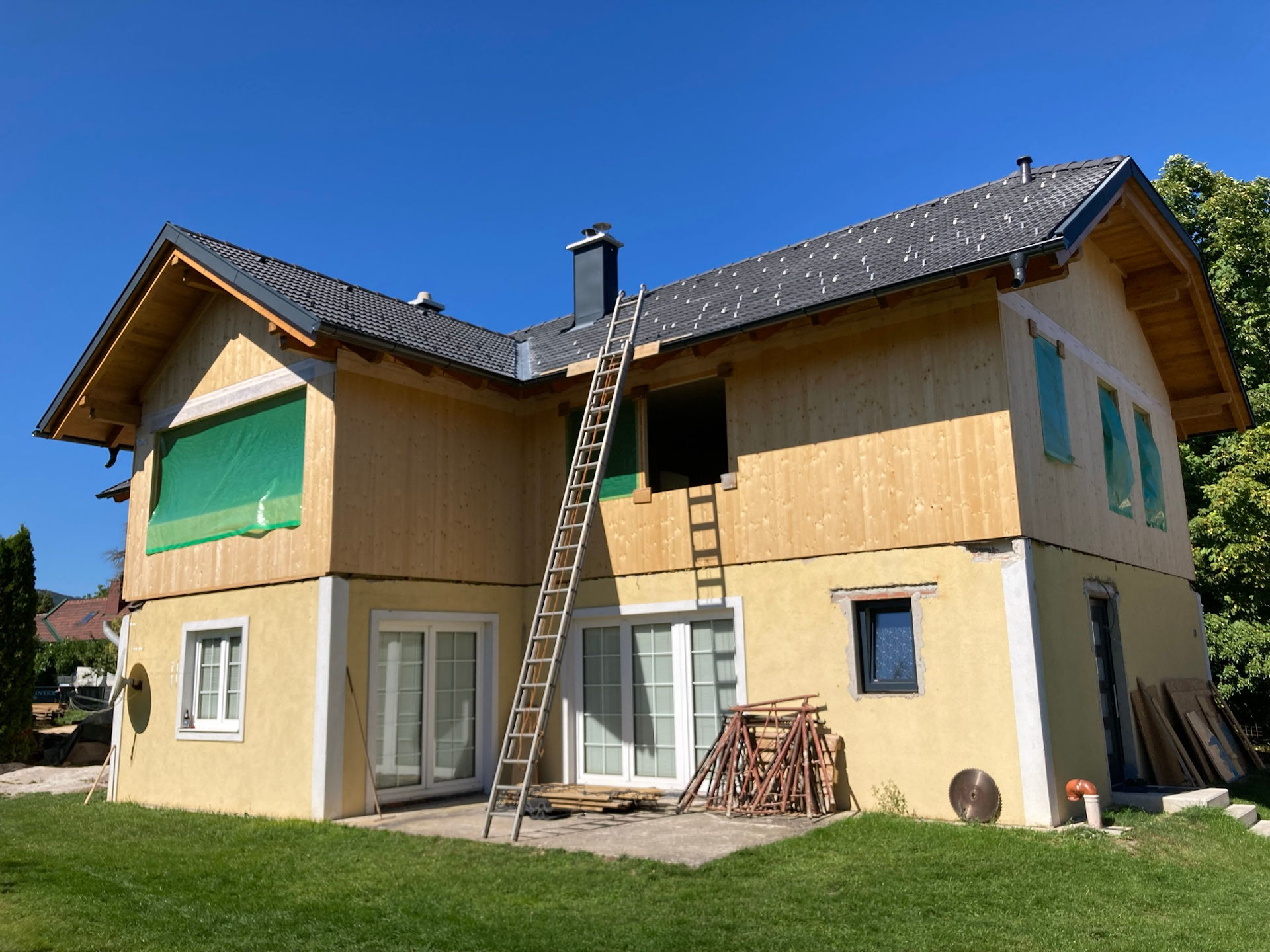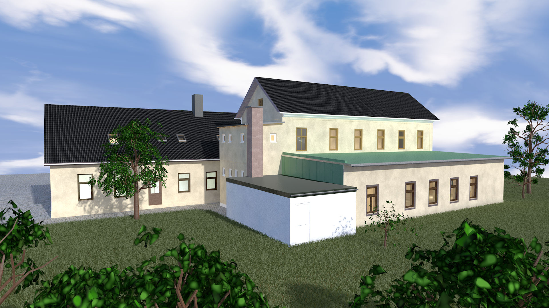 Das Bestandsgebäude und die angrenzenden Gebäude wurden mit dem Leica RTC 360 vermessen und in ArchiCAD modelliert. Das bestehende Gebäude wurde mit vorgefertigten Elementen in Holzmassivbauweise um ein Hauptgeschoss erweitert.